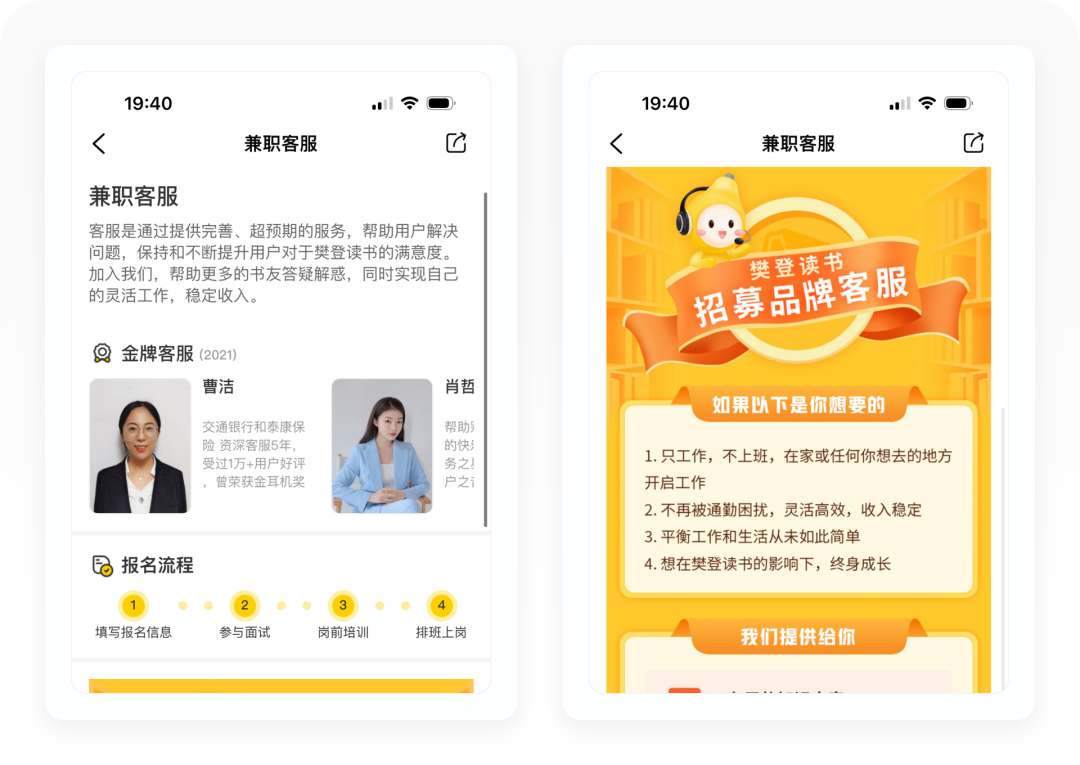 兼职客服就是主要帮助樊登读书处理客服的工作,只要用户有时间,都可以报名申请参与。