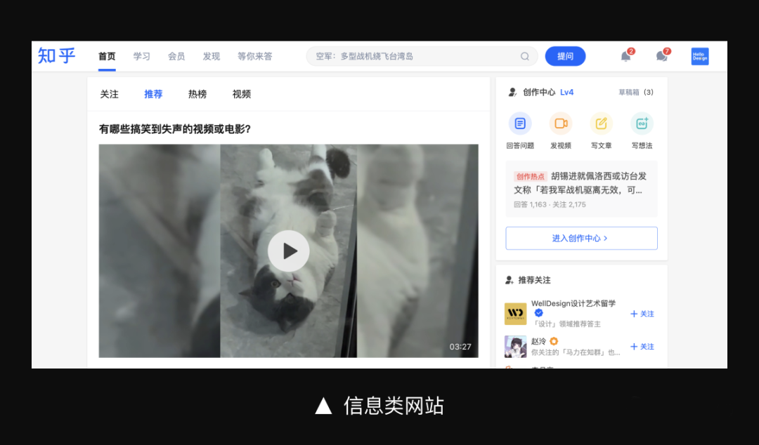 这种页面结构将页面划分为「顶部导航」和「内容区」上下两层。常见于一些企业官网、信息资讯网站中,更偏向于信息展示。例如阿里云官网、新浪、知乎等信息网站。一般包含系统logo、功能菜单、辅助功能、个人中心等。功能菜单通常按照业务板块进行设置,并且会限制菜单数量,一般为4-6个左右。根据业务需要,功能菜单也可以进行级联扩展,允许出现2级甚至3级菜单。方便用户更深层地了解系统功能,同时提高用户的操作效率,实现深层页面的快速直达。我个人认为,顶部导航的优势并不是不占用页面横向空间。因为信息展示类的网站对横向空间要求并不高,有些网站为了避免用户视觉横向跨度过大,采用的是版心定宽设计。企业官网产品则采用响应式布局,让界面可以适应不同的屏幕宽度。顶部导航的优势在于面积小,对页面的分割比较弱,不会对内容产生太大的影响。另外横向排布更符合用户的视觉习惯。在展示形式上,顶部导航更加灵活,可以将菜单形成独立的信息空间。例如百度官网的顶部导航,与Banner形成强烈对比,内容清晰可见。顶部导航也可以与页面内容融为一体,减少对内容的干扰。例如巨量引擎的官网中,将顶部导航与Banner信息混合,更加强调内容信息的传递。
