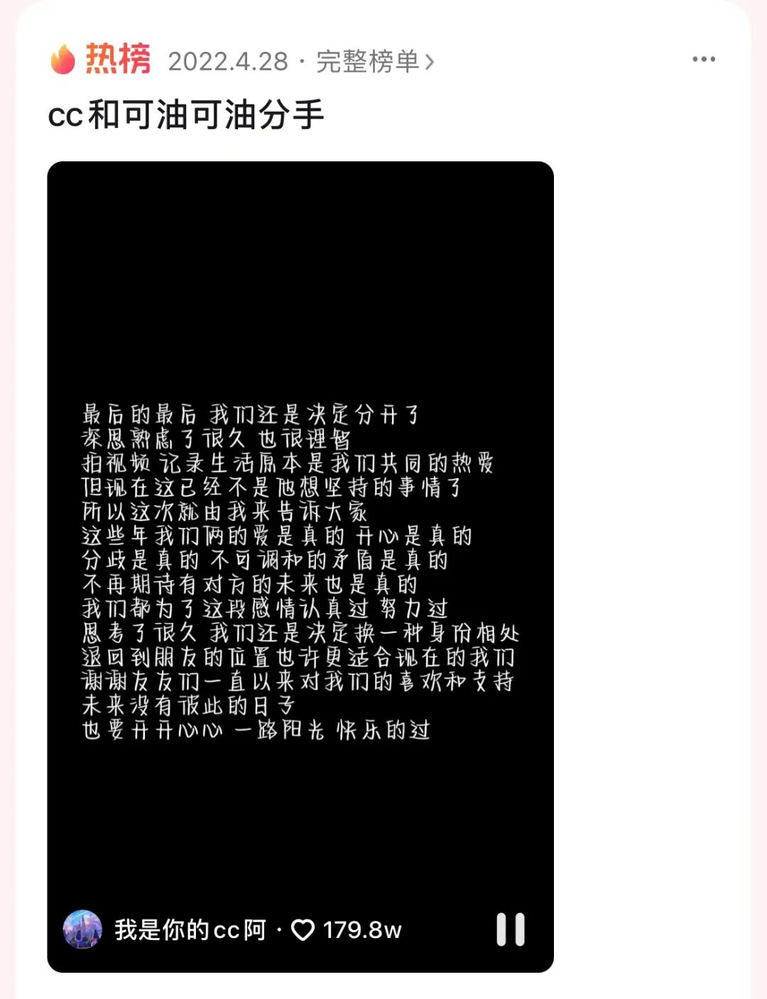 4月28日,@我是你的cc阿 和@可爱的QQ呀 官宣“分手”的消息登上抖音热搜。他们曾经的恩爱视频吸引了大批用户,也助推两人一同跻身千万大V之列,粉丝之和高达3284.6万。在两人分手后,很多网友去之前的视频下方留言,“为什么要在他们官宣离婚的时候给我推这个视频,是要让我更不相信爱情吗?”不止是cc和QQ,近两年来,组CP、拉郎、捆绑营销等玩法在短视频平台上越来越火热。2021年,痞幼、小霸宠、迅猛龙等网红迅速涨粉,都离不开丰富情感线的加持。一些头部网红并没有婚恋、亲戚等社会关系,但不影响网友疯狂脑补,从而形成多个热梗。比如,目前风头正劲的梅尼耶和痞幼的CP就衍生了不少“玩梗”空间,网友会自发评论,“传下去,痞幼和梅尼耶结婚了,孩子都两岁了。” 抑或是,当梅尼耶和其他女主播连麦时,网友就开始艾特痞幼,“梅尼耶出轨了。”