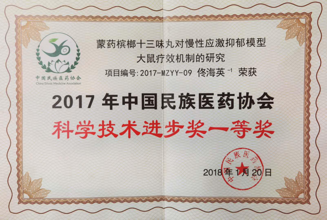 围绕蒙医“镇赫依法”,从“蒙医赫依-赫依与抑郁症-镇赫依法方药”现代解释方面进行了深入研究,通过研究发现赫依偏盛是抑郁症的最主要病因,“镇赫依法”经典制剂槟榔十三味丸能提高慢性应激大鼠单胺类神经递质水平和上调cAMP-CREB-BDNF信号通路,对抗慢性应激致抑郁模型大鼠HPA轴功能亢奋和HPT轴功能减低,改善HPA轴负反馈中枢功能障碍,其效果与氟西汀相仿。研究结果获得2017年度中国民族医药协会科学技术进步奖一等奖。