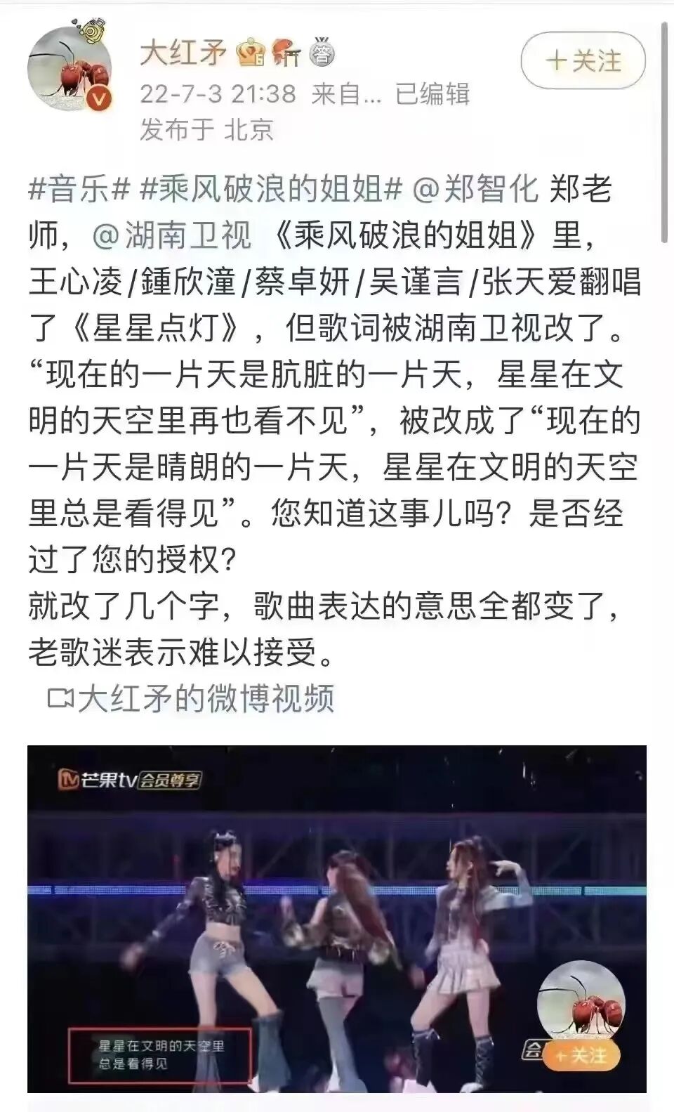 但需要说明的是,芒果台上热搜,不是因为节目质量好,而吸引眼球,而是因为乱改郑智化的《星星点灯》歌词。把星星点灯里的歌词“现在的一片天,是肮脏的一片天,星星在文明的天空里,再也看不见”,改成了“现在的一片天,是晴朗的一片天,星星在文明的天空里,总是看得见”。这么一改,看似在歌唱正能,其实这样一改,大大削弱了歌曲的力量。郑智化堪称是当代歌坛的鲁迅,他的歌曲具有批判性。人家的经典歌词本意是讽刺90年代的宝岛生态,你有啥可心虚的?都魔改成正能量,那还有艺术吗?此举惹得郑智化大怒,发微博进行声讨:关于我的经典歌曲“星星点灯”,被乱改歌词一事,我表示震惊、愤怒和遗憾!![]()
