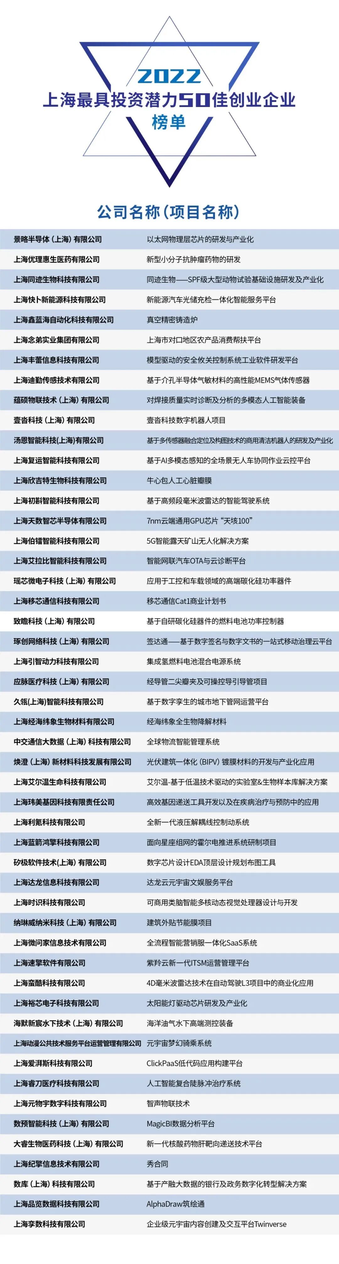本次活动于9月下旬正式启动,近700家创业企业参加了初选,最终120家创企入围终审角逐。这百余家企业接受了来自德同资本、领中资本等知名投资机构的10位投资人组成专家评委团的背靠背盲选。评选活动还在上海市企业服务云上开设了网络人气投票,并特别邀请了专业征信机构对企业及主要创始人诚信情况做了尽职调查,最终评选产生了“2022年上海最具投资潜力50佳创业企业”榜单。