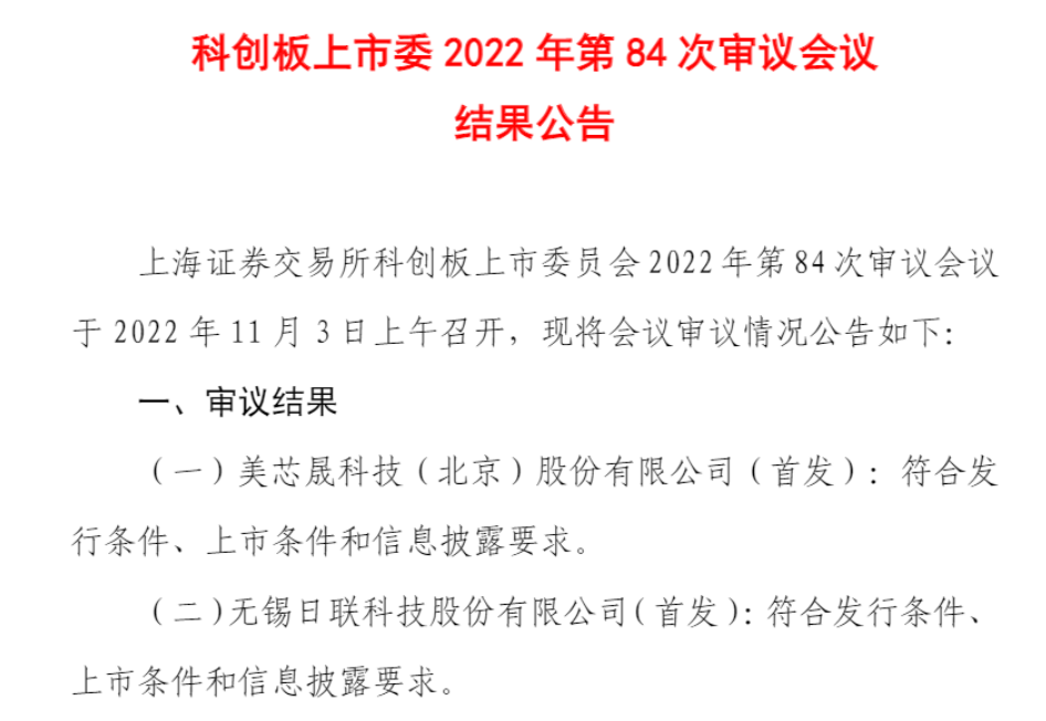 集微网消息 11月3日,据科创板上市委2022年第84次审议会议结果显示,美芯晟科技(北京)股份有限公司(简称:美芯晟)科创板IPO成功过会。
