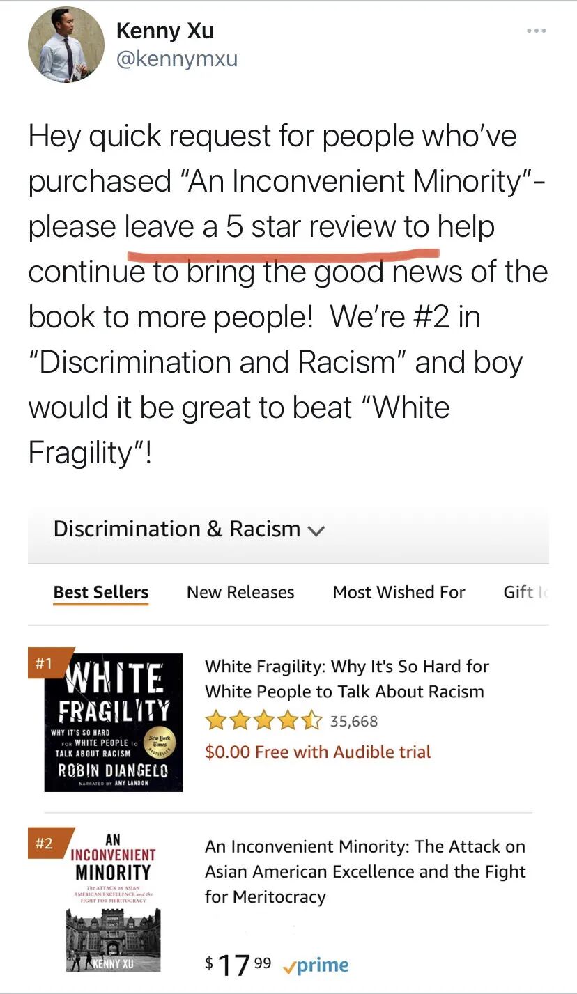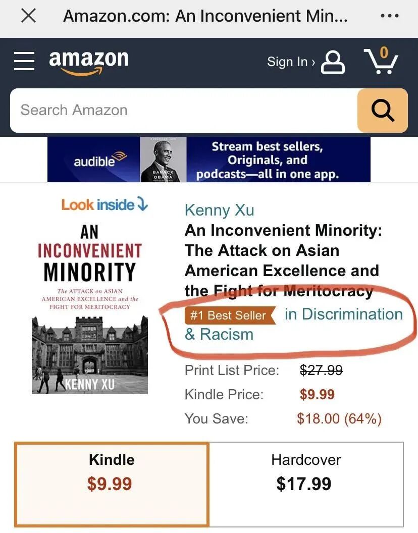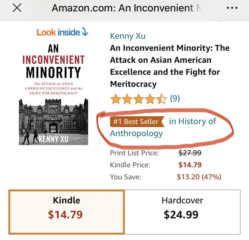 近年随着一些国际环境大局势的变化,担忧在美华人被边缘化的想法日益浓郁。不过实际上,那些拥有美国价值观和喜欢自己生活家园的华人,却依然受到这个社会的无条件拥抱。不必把个例、偶遇的不公,动辄上升到系统性歧视的程度。从Kenny频繁出现在全国性的媒体报道,被一个接一个的大V采访他推荐他的新书,就可以看到这种对亚裔的欢呼。下面数个书籍榜第一名的成绩就说明,如果你有对这个社会正面的思想和奉献,你完全没机会被埋没。一个个书籍榜第一名成绩的背后,是千千万万个认同他理念的人。An inconvenient minority(书名:一个棘手的少数族裔)在预售阶段就已经成为亚马逊“亚裔历史书籍类”排行第一。正式发行的第一天,冲上“探讨歧视和种族主义问题类书籍”排行第一。这个类别下紧咬着排第二名的是CRT方迷恋的White Fragility一书,他们在用免费派送的形式吸引读者,因为背后是资金雄厚的一个产业链在推。这是一个惊人的成绩,由于美国随着去年夏天的Floyd案及随后引爆的BLM运动,种族问题是社会聚焦,支持CRT的一方注入了亿万美元要发起一场席卷教育界、企业界和文娱圈的革命。Kenny的书有点像一位少侠向武林盟主相约辩论,有初出茅庐即一战成名的势头。对比参考,这个类别下,近期最新销售额排在第二的是以色列新锐历史学家尤瓦尔·赫拉利代表作品,《人类简史》(Sapiens: A Brief History of Humankind),排第六的是2016年名噪一时的J. D. Vance的《乡巴佬的挽歌》(Hillbilly Elegy)。随着热门畅销,该书也有洛阳纸贵的趋势,Kindle和影印版本的价格都在稳步提高。大家抓紧买一本,按此趋势以后价格还可能会上涨。尤其给自己的下一代看看,自信还是自卑,这是个不需要思考的问题。还可以送给当地的图书馆或者建议图书馆去购买,扩大影响。Kenny的书之所以开门红,还有关键的一点就是,从东亚文化的角度做好了assertive(表达能力方面的自信果敢决断)的叙事。就是我们以前分析过的,行事自信,总是能清楚、坚定、从容地表达自己的需求,并让他人充分注意到。(点击前文)再加上对美国在社会思潮分叉路口,引发一场与CRT分庭抗礼的及时雨一般的辩论,所以一发行就获得强劲的开局势头。最后笔者用英文说一句,The country is on our shoulders too, as long as you identify yourselves as freedom lovers.购书链接:https://amzn.to/3xCSm35 (点击文末左下角"阅读原文/Read more")或者 扫码购买