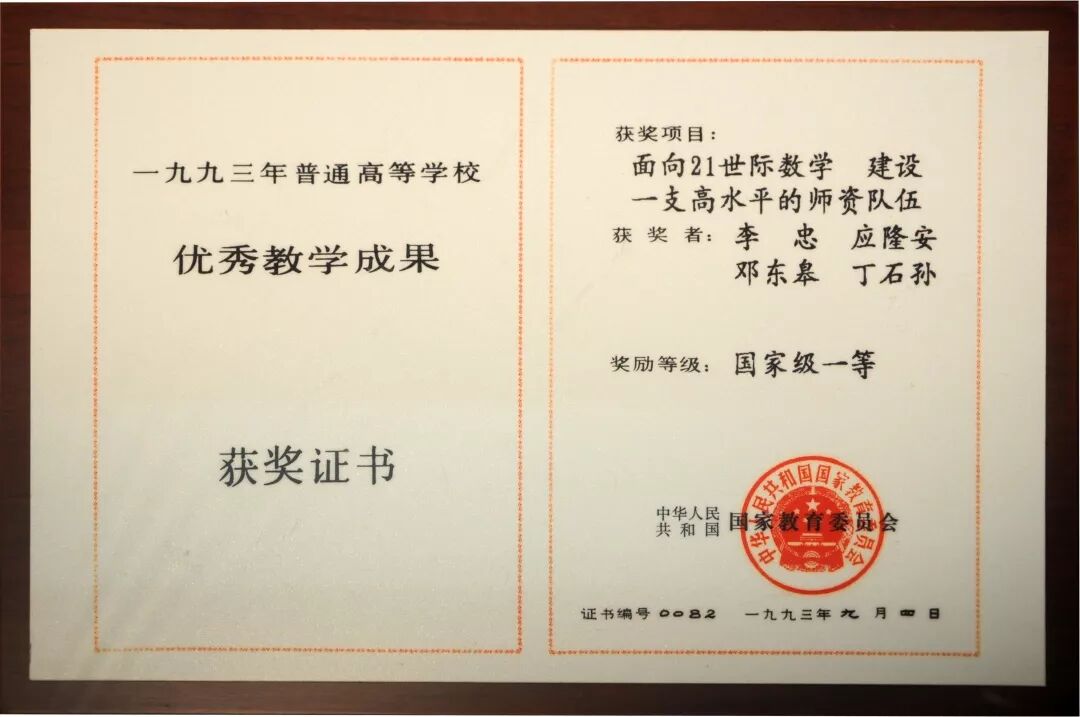 1993年数学系的师资队伍建设项目获国家教学成果一等奖,数学系成为国家 “理科基础研究和教学人才培养基地”。