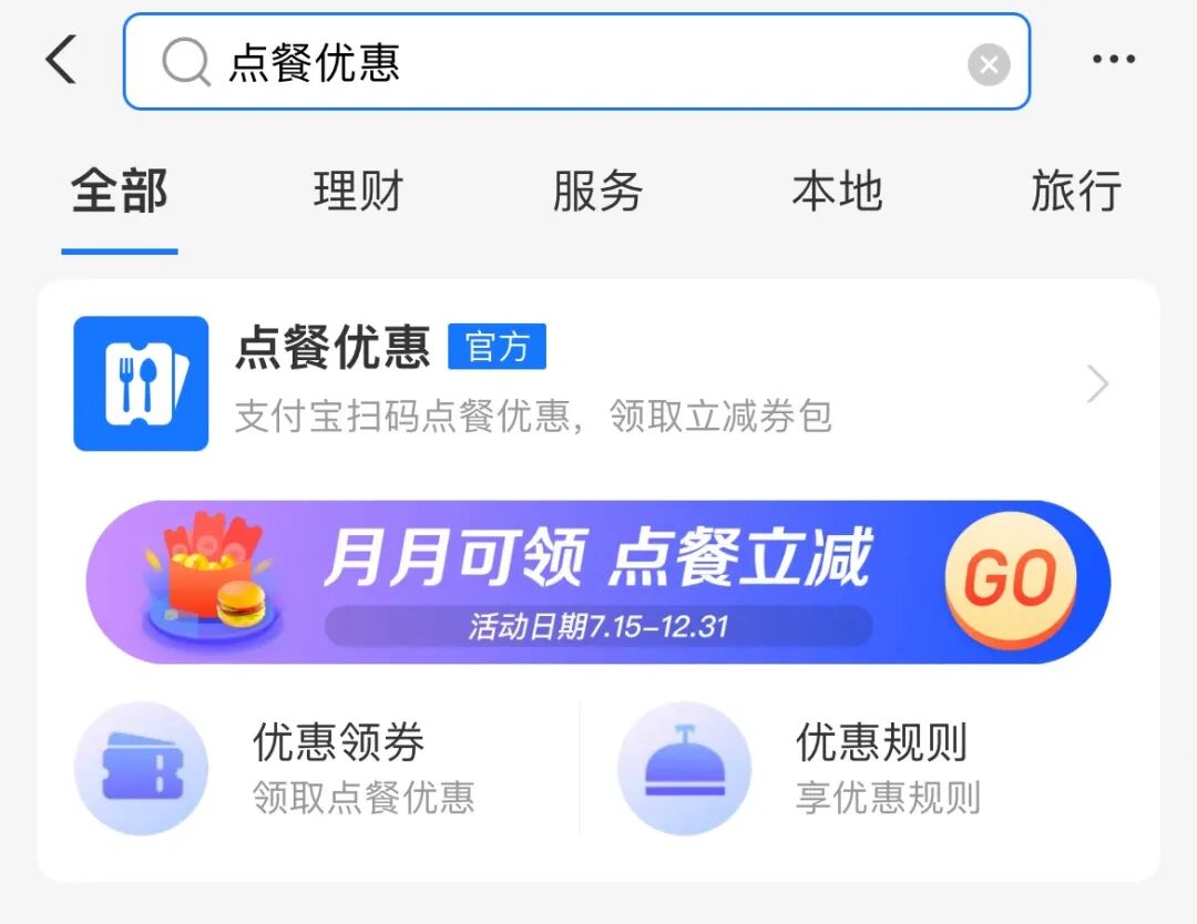 支付宝App首页搜索“点餐优惠”获取0.5+0.5+0.5+0.5点餐红包