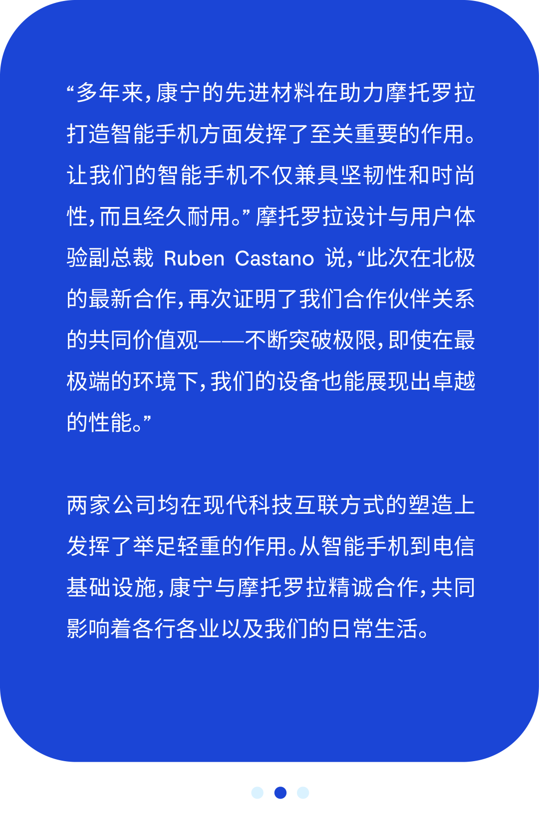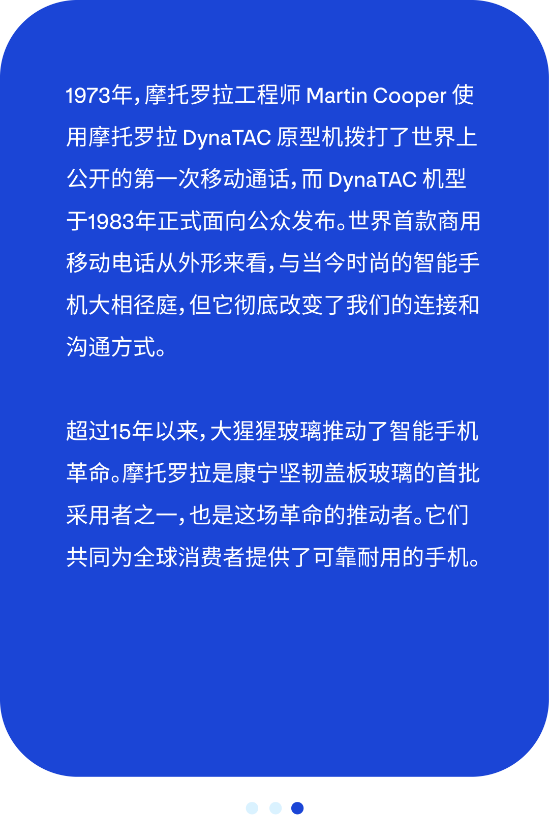 2009年,摩托罗拉凭借motorola Droid系列进入智能手机市场。Droid是最早获得广泛应用的设备之一,其显示屏盖板应用了第一代大猩猩玻璃。Droid上市仅74天销量就超过了100万部。从那时起,康宁和摩托罗拉携手合作,将无数经久耐用的现代智能手机设计送到全世界消费者手中。