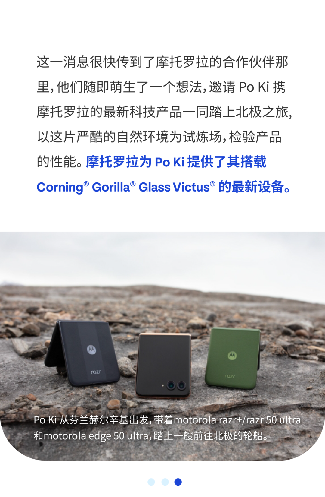 大猩猩玻璃副总裁兼总经理Dave Velasquez表示:“康宁和摩托罗拉长期以来一直携手合作,共同打造无论身在何地都能经受住考验的设备。无论你是日常通勤,还是像 Po Ki 一样开启毕生难忘的一次探险之旅,康宁大猩猩玻璃都足够坚韧,助你应对各种人生场景。”