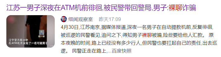 《江苏一男子深夜在ATM机前徘徊,被民警带回警局,男子:裸聊诈骗》