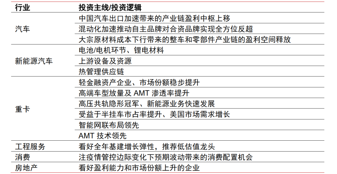 中观层面,近期汽车板块出现较大程度回调,但我们仍看好板块在22Q4销量持续向上的趋势和盈利弹性。新能源汽车方面,行业向上趋势明确,全球新能源汽车产业链已步入高速成长阶段,当前时点继续建议把握全球电动化供应链优质标的机会。当前时间处于重卡行业底部,预计重卡行业销量在22Q4将呈现回暖态势,23Q1起回暖趋势有望继续加强。预计下半年存量的政策压实效果以及增量的政策将逐步落地,基建增速将较上半年再上一个台阶,看好全年增长弹性。银行估值历史底部确认,对投资空间的把握易于投资时点,行业步入绝对回报期。