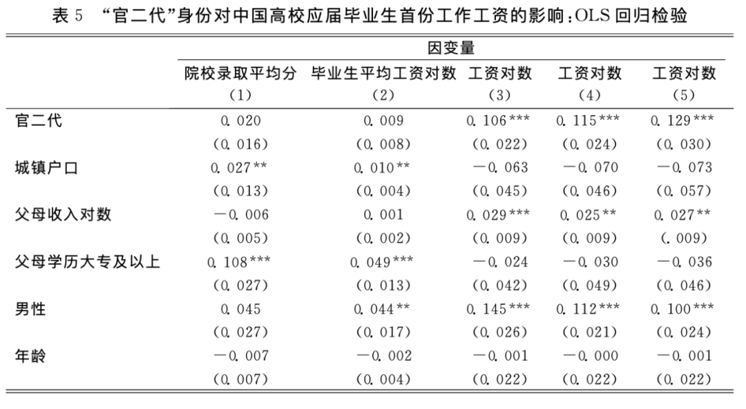 尽管仍然存在一些不可观测的人力资本因素可能与 “官二代”身份相关,但鉴于我们可以观察到的人力资本指标都与 “官二代”身份不相关,我们基本可以认定剩余的工资溢价就是 “官二代”身份本身在大学生劳动力市场中的回报。