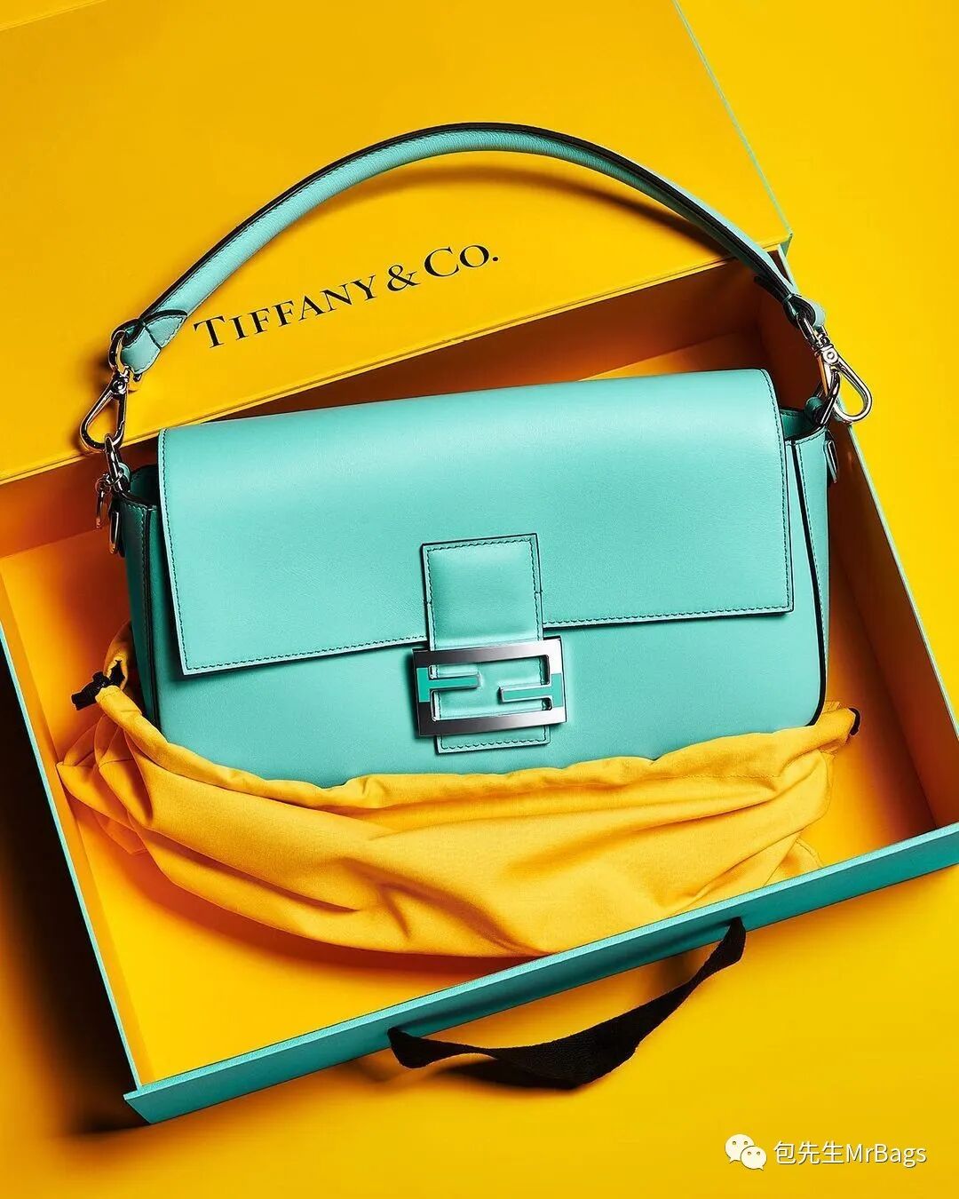 同时,包包的FF Logo锁扣上还带有蓝色珐琅的T字Logo,巧妙地将Tiffany和Fendi的标识融合到了一起!