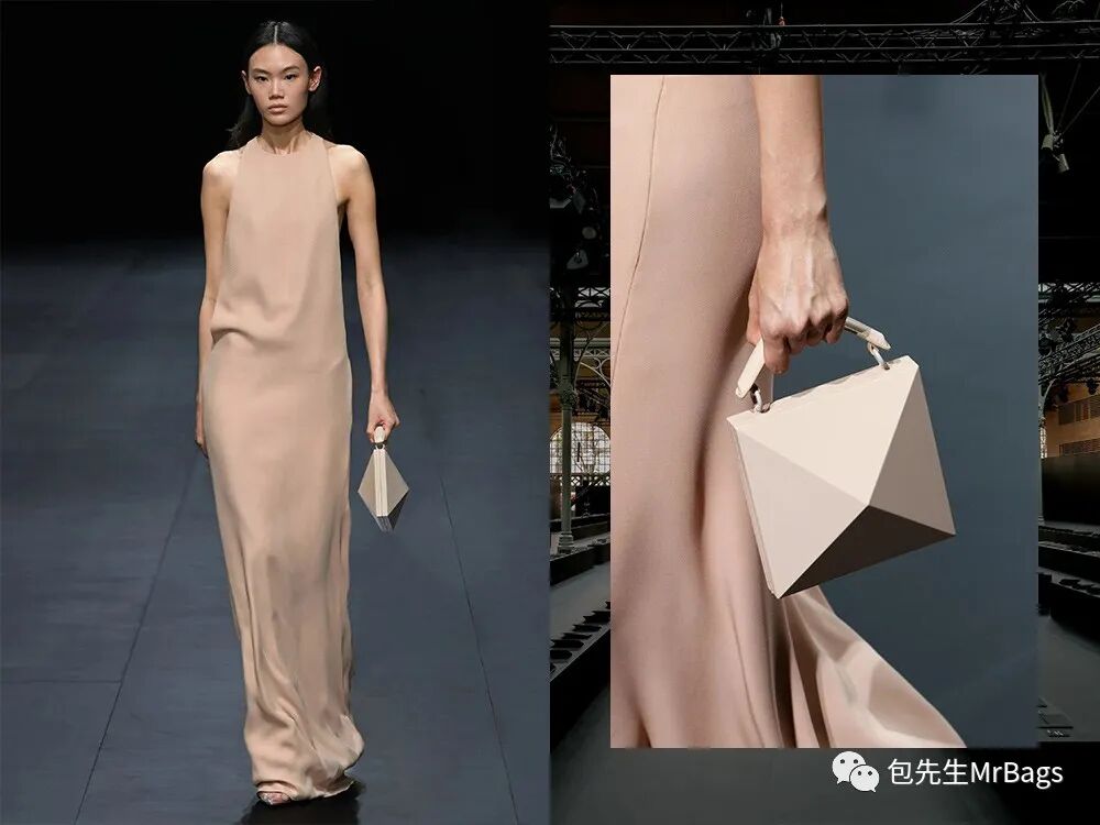 这款手包真的蛮好看的,很有未来感的同时,简约的几何设计,搭配同样简单的单色连衣裙,干干净净又很显质感。