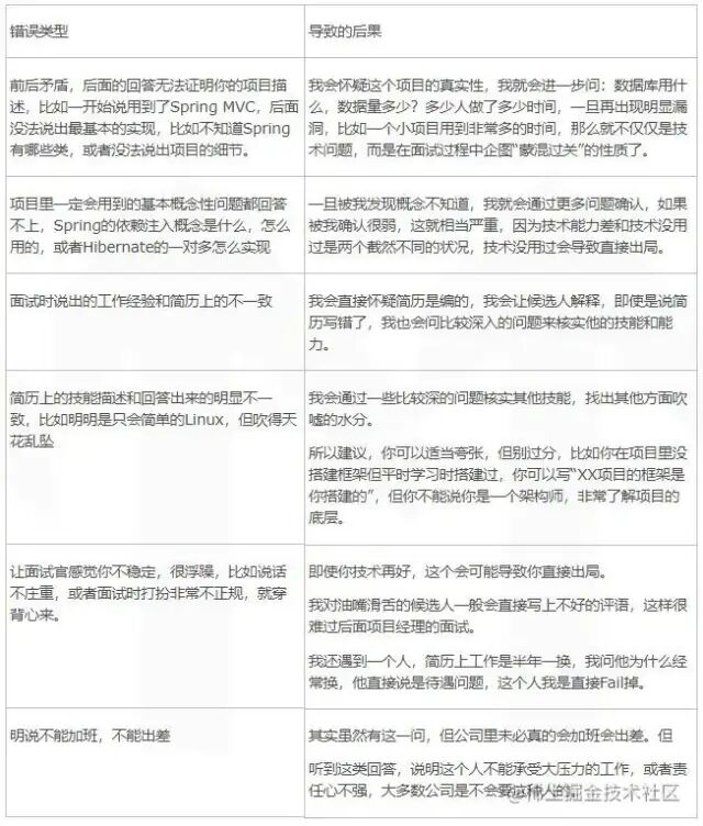| 描述项目时,一些关键要素(比如公司、时间、所用技术等)和简历上的不匹配 | 我们会深究这个不一致的情况,如果是简历造假,那么可能直接中断面试,如果真的是笔误,那么就需要提供合理的解释 |
