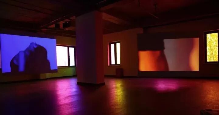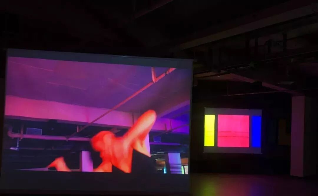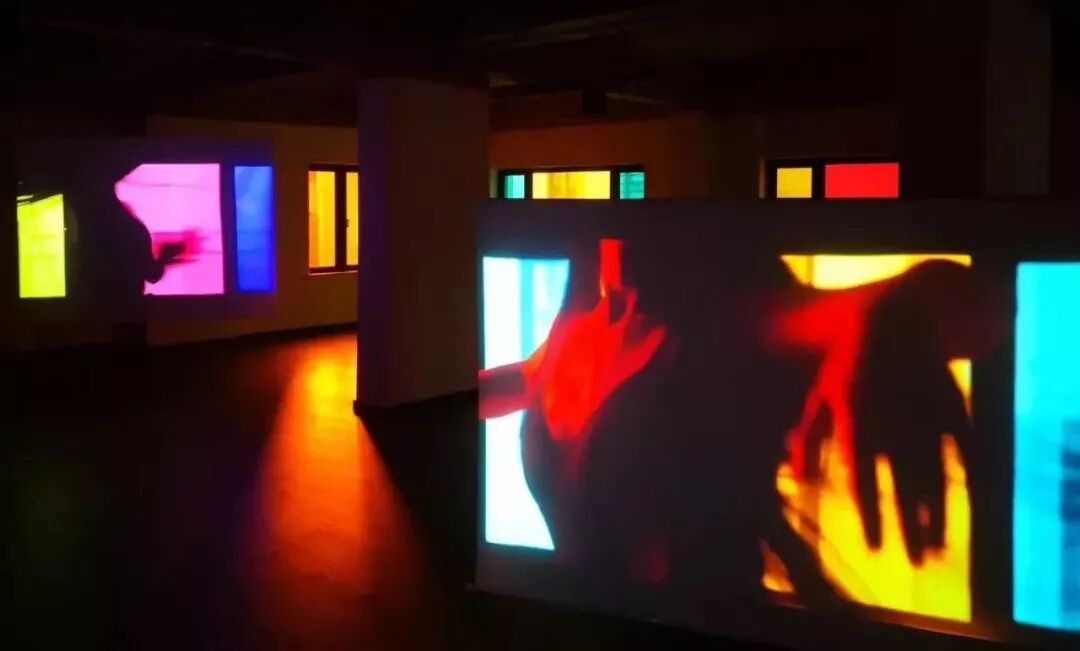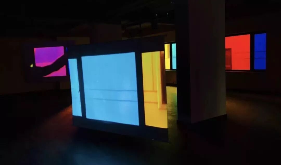 吴野《蒙尘》影像作品现场,我们看到多个屏幕呈林状分布于现场空间,不同影像空间相互呼应相互包含与现场几何彩色玻璃构成了一个色彩分割的装置现场,这些色彩鲜艳带霓虹感的块状色彩玻璃构成了在场的空间布局,犹如蒙德里安的几何分割图让整个空间饱满充盈并带有整体的图像关系结构,蒙德里安是平面理性的冷静分割,吴野则是在这种视觉图形情景中来完成了一种导入式的空间游戏。