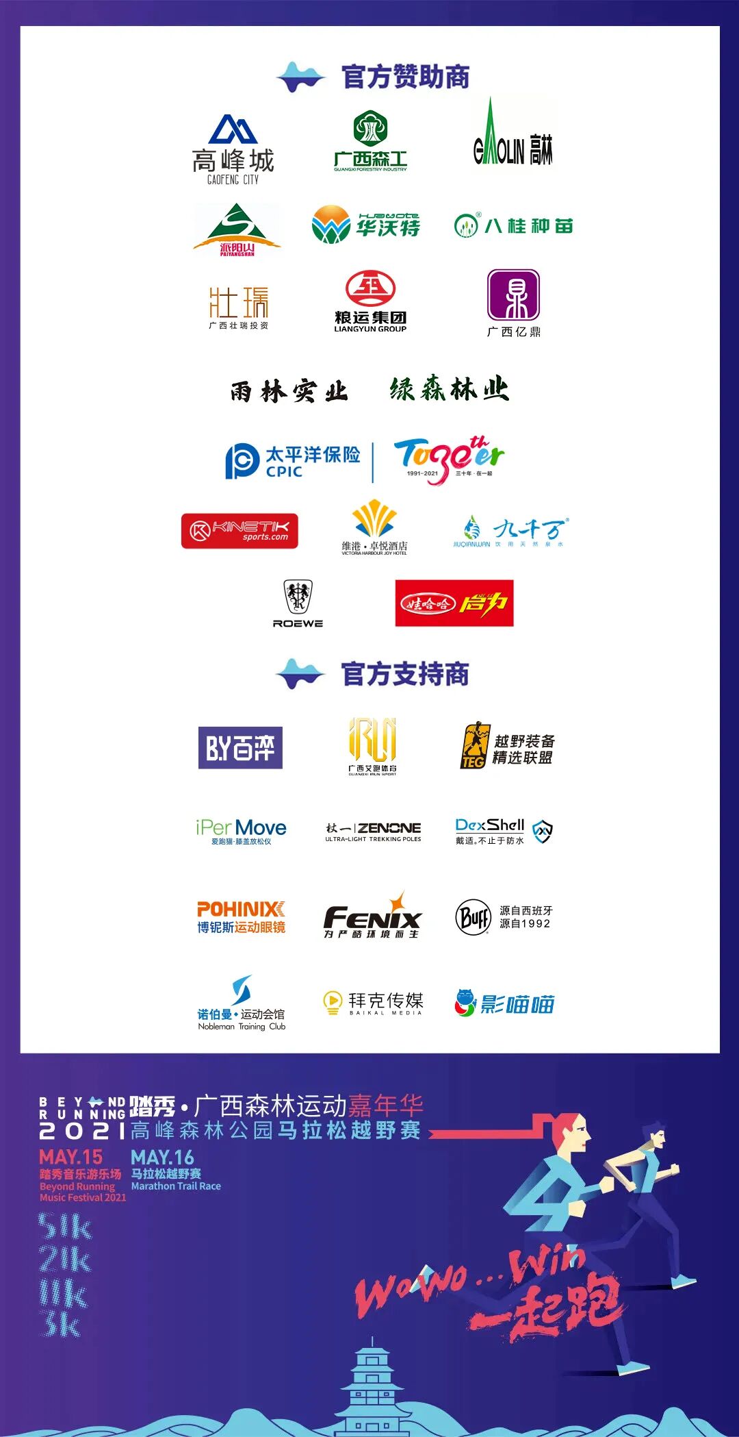 2021 踏秀·广西高峰森林公园马拉松越野赛得到了广西艾兴投资有限公司、广西森工集团股份有限公司、广西祥盛家居材料科技股份有限公司、广西华沃特生态肥业股份有限公司、广西八桂林木花卉种苗股份有限公司、广西壮瑞投资有限责任公司、广西粮运物流集团有限公司、广西雨林实业投资有限公司、广西亿鼎安吉投资有限公司、广西绿森林业有限公司、太平洋保险、KINETIK(肯乃迪克)、维港卓悦酒店、九千万、荣威、娃哈哈启力等合作伙伴的大力支持!