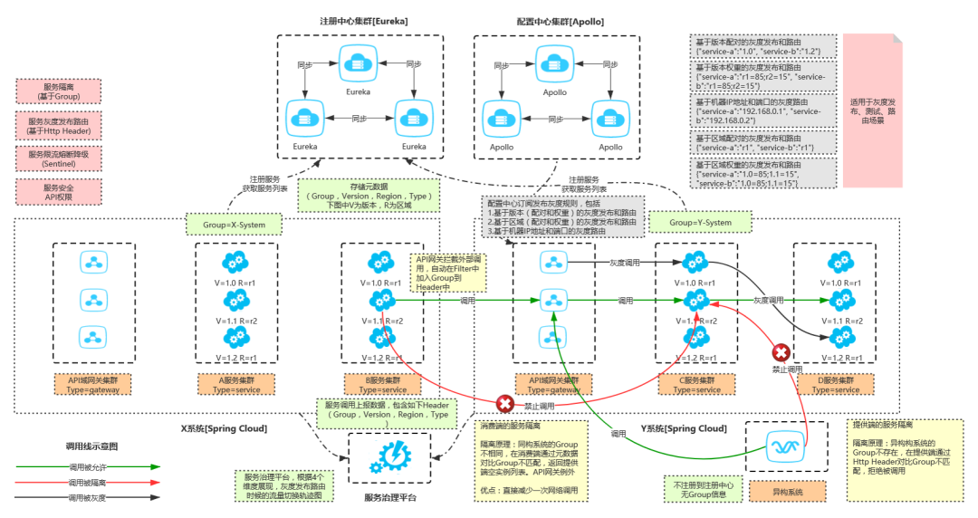 在 Nacos 和 Eureka 双注册中心过渡状态下, Solar SDK 支持跨注册中心调用的蓝绿灰度发布和子环境功能。下面的图片,只以 Eureka 为例: