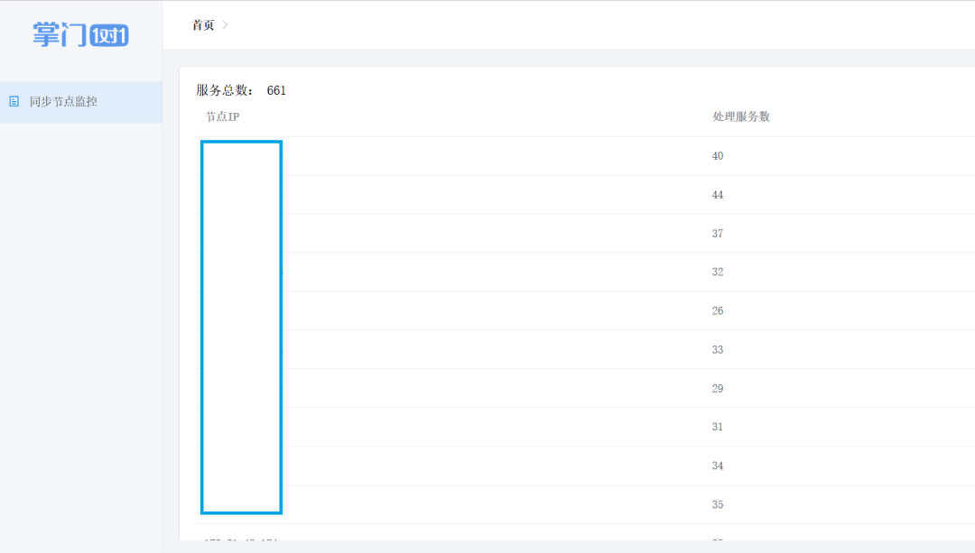 从如下界面可以监控到,业务服务列表是否在同步服务的集群上呈现一致性 Hash 均衡分布。