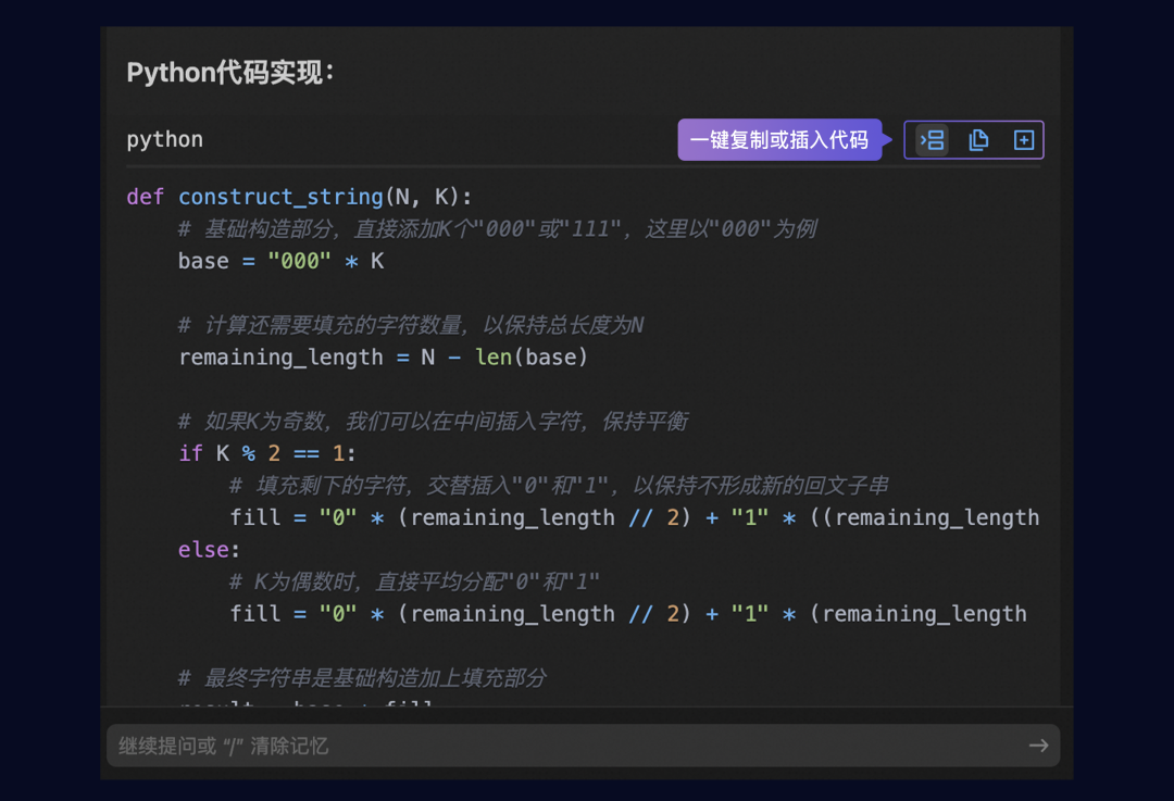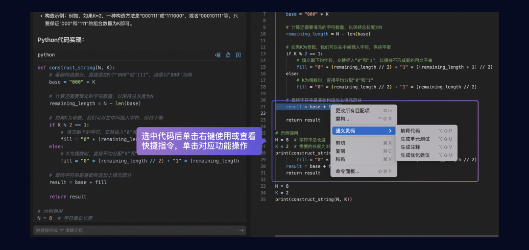 同样地,输入“@灵码 笔试题”,通义灵码将随机从后台题库中回复 5 道算法编程类题目,你可以根据自己的需求任意选择题目进行作答,让通义灵码判断你的答案,或将题目复制给通义灵码向它提问。互动方式与前文相似,此处不再赘述。通义灵码的智能问答及智能生成代码功能,将帮助你解答你的问题并为你生成代码建议;此外,通义灵码提供的代码示例,可支持一键插入或复制代码。当你选中代码后,通义灵码还支持生成单元测试、代码优化、代码注释或代码解释,可选中代码后单击右键使用或查看快捷指令,单击对应功能操作。点击阅读原文,立即参与通义灵码“求职季”特别活动,欢迎分享你关于使用通义灵码高效备战求职季的经验。相关链接: