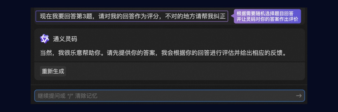 你也可以根据自己的岗位需求,在问答框选择输入“@灵码 我是算法”、“@灵码 我是前端”、“@灵码 我是后端”,通义灵码将自动回复 5 道定向岗位面试题,如:得到面试题后,可根据需求随机选择题目进行回答,并让通义灵码对你的答案作出评价。如输入提示词“我现在要回答第 3 题,请对我的回答作出评价”。如果你想了解题目的正确答案及解答思路,可在问答框直接将答案复制给通义灵码,并向它提问,通义灵码的智能问答能力将为你提供即时、准确的知识解析,帮助你快速学习,如:2.2.2 随机了解 5 道聚焦编程算法方向的笔试题