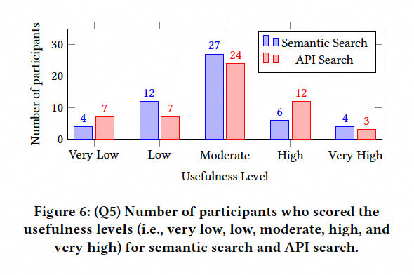 表 5 显示了代码搜索成功率低(0.21)。语义和 API 搜索的结果没有统计学意义(p 值 <0.05),根据双样本 Kolmogorov-Smirnov 测试,在显著性水平为 5% 的情况下。这主要是因为开发人员通常只查看前几个搜索结果(#Viewed <14),并且他们发现有趣的搜索结果的数量往往少于两个(#Interested <2)。这些结果证实了现有代码搜索研究中的假设。在我们的研究中,代码搜索工具的性能较低,其 MRR 为 0.16。语义和 API 搜索在两样本 Kolmogorov-Smirnov 测试中的 p 值无统计学差异。然而,在用户认为有趣的结果方面,MRR 显著较高,在前三个排名中达到 0.77,并且平均 FRank 为 2.29。这些结果表明,如果出现在前三名,开发人员倾向于点击他们觉得有趣的结果,以探索细节或选择复制粘贴。然而,在许多情况下,搜索结果不能直接应用于满足用户的实现要求。此外,开发人员可能会基于有用的搜索结果编写代码,或者表达对某些代码的兴趣而不采取进一步的行动。因此,衡量代码搜索的实际性能仍然具有挑战性。![]()