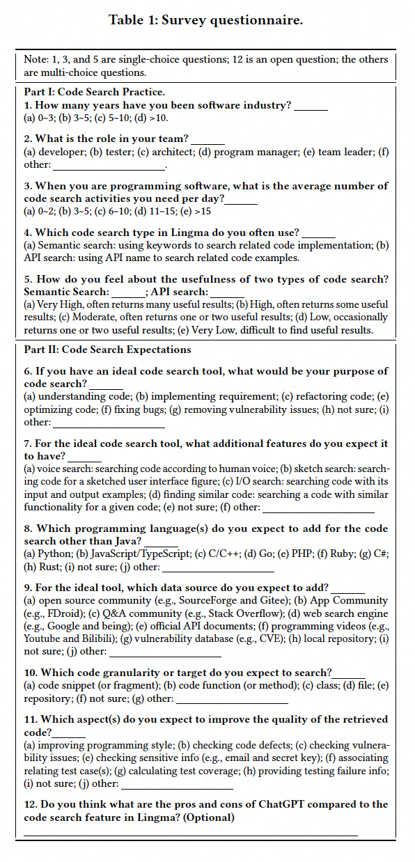 3. 开发者通常只查看代码搜索结果中排名前几(前三名)的结果。这种行为强调了对高度相关性代码搜索工具的需求。此外通过发放调研问卷,以了解用户对代码搜索的看法和未来期望。该问卷是在对定量分析的理解和最近对代码搜索研究的系统综述的基础上起草的。它经过了阿里两位高级开发人员参与的小规模研究的改进。此外,我们还与七位受访者进行了面对面访谈,深入了解他们的调查回答,并收集了额外见解。一些主要发现包括:1. 有经验的开发人员可能不会经常进行代码搜索;但是,当他们这样做时,他们会期望工具非常有效。尽管如此,对于语义搜索用户来说,编写精确的查询仍然是一个挑战。2. 在实践中,开发人员会出于各种目的(例如程序理解)来搜索代码。他们希望未来的工具能够集成来自不同来源(例如 API 文档)的多种编程语言的代码库(例如 Go 和 JavaScript)。这些工具应该支持对代码的不同粒度的搜索(例如片段和类),并为搜索结果提供额外的质量改进(例如错误检测和编程风格检查)。3. 开发者希望代码搜索工具具有类似于 ChatGPT 的增强查询理解能力。他们期望搜索结果简明扼要、代表性强、易于理解,并且能够适应编程上下文,无需或只需很少修改。总结来讲: