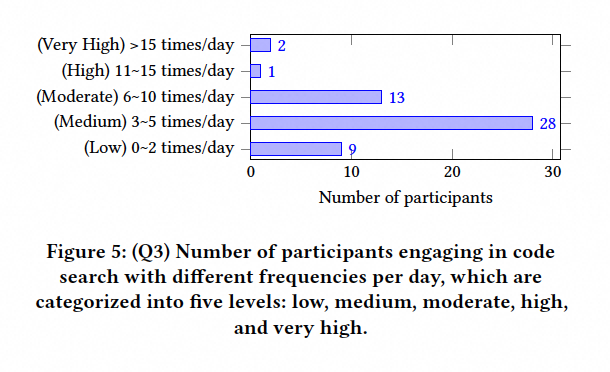 图 5 显示,9(16.98%)参与者很少执行代码搜索(0 到 2 次),而 28(52.83%)参与者表示中等频率地执行代码搜索(3 到 5 次)。其余 3 名参与者以高频率(11 至 15 次)或更高频率(> 15 次)执行代码搜索。根据受访者的反馈,他们“只在需要时才使用代码搜索工具”,并且他们“非常了解其编码环境”。这种趋势可能是受访者经验丰富的结果。因此,每个用户每天平均执行代码搜索的次数保持较低,如第节中讨论的那样。![]()