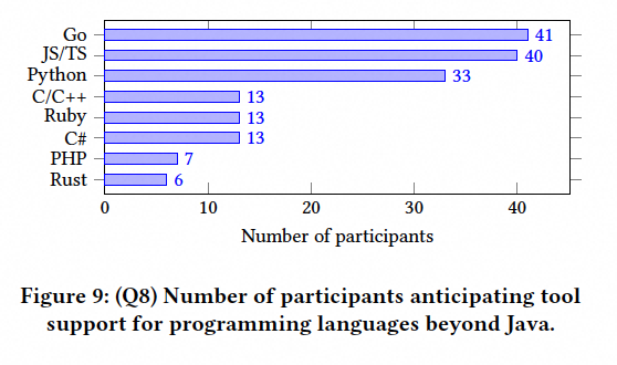 图 9 显示,许多受访者支持在代码搜索中扩展 Java,以包含另外三种编程语言:Go(77.4%)、JS/TS(62.62%)和 Python(75.5%)。C/C++、Ruby 和 C# 各有 13 票。PHP 和 Rust 各获得另外 13 次选择。这些结果强调了开发者实际使用编程语言的多样性。所有受访者都强调了这种扩展的必要性,因为“他们需要使用它”。此外,一位受访者强调了扩展 Rust 的实用性,因为“这门编程语言对他们来说是新的”。![]()