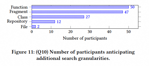 图 11 表明,大多数受访者(>88%)表示对搜索代码功能或片段感兴趣。受访者指出这两种类型很有用,因为它们“需求通常很小很具体”,并且他们“希望分解这些要求”。此外,27 名受访者(50.94%)发现搜索类很有用,而另外 14 名受访者更喜欢搜索存储库(22.64%)或文件(3.77%)。这些结果强调了开发人员对搜索更高粒度的代码目标的期望。![]()