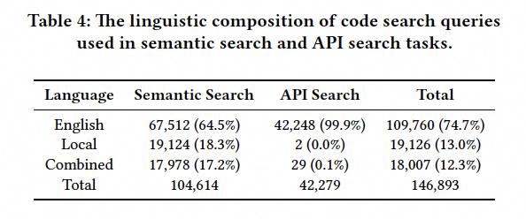 - RQ2:查询的特点是什么?本题考察用户查询,重点关注词数和语言,并分析两种代码搜索类型的差异。