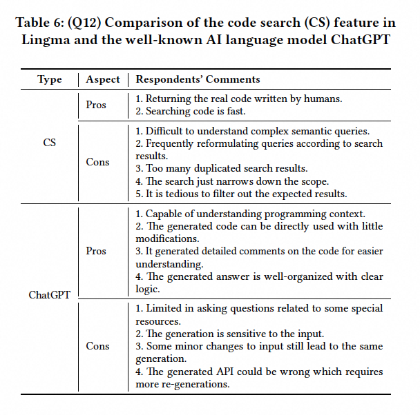 图 12 展示了对代码搜索期望的七种质量改进。根据降序排列,47 位受访者(88.68%)表示需要一种工具来检查在开发人员编程环境中返回的代码中的错误。此外,39名受访者(73.58%)要求返回的代码符合他们的预期编程风格。另外,24 名受访者(37.74%)希望在检索到的源代码中搜索相关测试用例。15 名受访者(28.30%)担心代码中的敏感信息,并希望删除它们,例如秘密密钥和电子邮件地址。另外,有 13 位受访者(占 24.53%)要求未来的工具能够显示搜索代码的测试覆盖率,同样数量的受访者(占 24.53%)希望了解相关的测试失败信息。受访者表示,这种排名很自然。他们强调:1)发现错误很重要,因为“代码搜索可以帮助编写代码,但代码可能无法在集成开发环境中运行”,并且他们更喜欢“不调试搜索到的代码以节省精力”;2)“代码需要遵循企业的编程风格”;3)“其他功能看起来很有用,但不是首要任务”。表 6 显示了受访者对灵码代码搜索功能与知名 AI 语言模型 ChatGPT 之间优缺点的正面和负面评论。总的来说,代码搜索的主要优势在于快速响应时间和检索人类编写的代码,而 ChatGPT 则不具备这些特点。然而,代码搜索在处理复杂查询时面临挑战。因此,开发人员通常需要根据搜索结果来细化他们的查询,这可能会很繁琐。此外,由于搜索列表中存在许多重复的结果,评估预期结果的相关性也很费力。这些观察结果与受访者的反馈一致。此外,一位受访者提到,“当他们知道正确的关键字并有信心找到预期的代码时,他们会使用代码搜索工具”。![]()