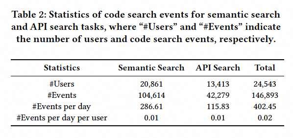 表 2 显示:展示了来自 24,543 名同意记录其代码搜索行为的用户的见解。在这些用户中,有 20,861(85%)人进行了语义搜索,而 13,413(54.7%)人使用 API 搜索来查找代码示例。值得注意的是,9,731(39.6%)名用户参与了这两种代码搜索类型。这些结果表明,许多用户希望以混合的方式使用两种代码搜索方式,并且更喜欢语义搜索而不是 API 搜索。这些用户共产生了 146,893 次代码搜索事件,其中 104,614(71.2%)次事件归因于语义搜索,42,279(18.8%)次事件归因于 API 搜索。平均而言,每天会有 402.45 次代码搜索请求,其中 286.61 和 115.83 次分别用于语义和 API 搜索。然而,对于每个用户来说,每天只有 0.02 次代码搜索事件。这表明虽然语义搜索的使用频率更高,但用户只是偶尔会使用代码搜索工具。当该工具不能满足他们的需求时,他们可能会转向替代方法,如网络搜索引擎。因此,开发人员会在实践中始终解决他们的问题时认为代码搜索工具是有价值的。![]()