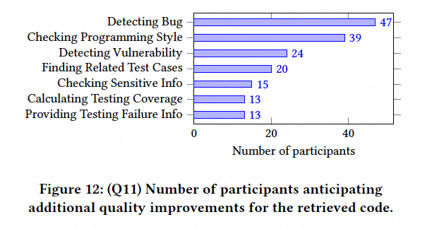 随后,33 名受访者(占 62.26%)表示更喜欢使用代码搜索工具来查找编程错误的解决方案。根据受访者的反馈,在遇到编程错误时,他们通常会“复制错误信息或相关源代码到搜索引擎中,并尝试找到一些解决方案”。正如前文分析的那样,这种做法可能会导致查询语句过长。然而,现有的代码搜索工具并不总是适用于此类查询。此外,18 名受访者(占 33.96%)希望代码搜索结果能帮助他们修复漏洞。最后,13 名和 11 名受访者预计理想的代码搜索工具可以帮助他们优化(占 24.53%)或重构(占 20.75%)返回的代码。尽管如此,一些经验丰富的受访者指出,“我想自己来做优化或重构”,这是因为“它们是我的强项;我会决定这些任务是否需要紧急完成。”