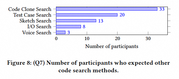 图 8 列出了通义灵码中没有包含的五种代码搜索方法。它揭示了 33 名受访者(62.26%)对代码克隆搜索的兴趣,即输入代码片段以检索代码库中的相似代码。此外,22 名受访者(37.74%)希望根据给定的测试用例搜索目标源代码。另外,13 名受访者(24.53%)预计会使用用户界面草图来搜索代码。其余 18 名受访者希望有一个理想的代码搜索工具,该工具可以根据输入输出示例(15.09%)或语音(5.66%)工作。受访者表示,代码克隆搜索是有价值的,因为它可以让他们“找到一些相同的修改的重复代码段”。然而,许多受访者对其他代码搜索方法的有效性提出了疑问,因为他们“想不出任何例子来使用它们”。![]()