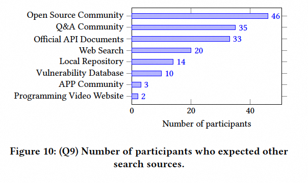 表 10 显示,超过 33 名受访者表示有兴趣从其他开源社区(86.79%)、问答社区(66.04%)和官方 API 文档(62.62%)中添加其他搜索源。这些来源与受访者所描述的开发人员常见的搜索实践相一致。此外,20 名受访者(37.74%)选择了网络搜索,受访者指出“网络搜索涉及许多其他来源”。14 名受访者(26.42%)发现本地存储库中的代码搜索有用。一名受访者表示,“如果我有权限,我想知道在企业级本地存储库中如何实现要求。”此外,还有 10 人、3 人和 2 人(18.87%)选择漏洞数据库。![]()