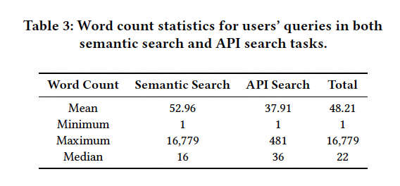 表 3 显示:语义搜索查询的平均词数超过了 API 搜索(52.96 比 37.91)。根据双样本 Kolmogorov-Smirnov 检验,两项任务的词频分布存在显着差异(p 值 <0.05)。然而,语义搜索和 API 搜索的中位数计数显示了相反的大小关系(16 与 36)。这些结果表明,在大多数情况下,语义搜索查询往往较短,而 API 搜索查询较长。如图 1 所示,由于开发人员经常选择工具推荐的完全限定名称的候选 API,因此 API 搜索查询往往更长。这种推荐有助于用户定位目标 API。此外,人们普遍认为语义搜索查询是简洁的,通常由动词短语组成。我们观察到开发人员可能会通过从工具中选择推荐的候选查询或复制运行时日志来输入冗长的查询以查找调试代码示例。因此,开发人员不仅期望语义搜索充当编码助手,如现有研究所示,还希望它充当调试助手。![]()
