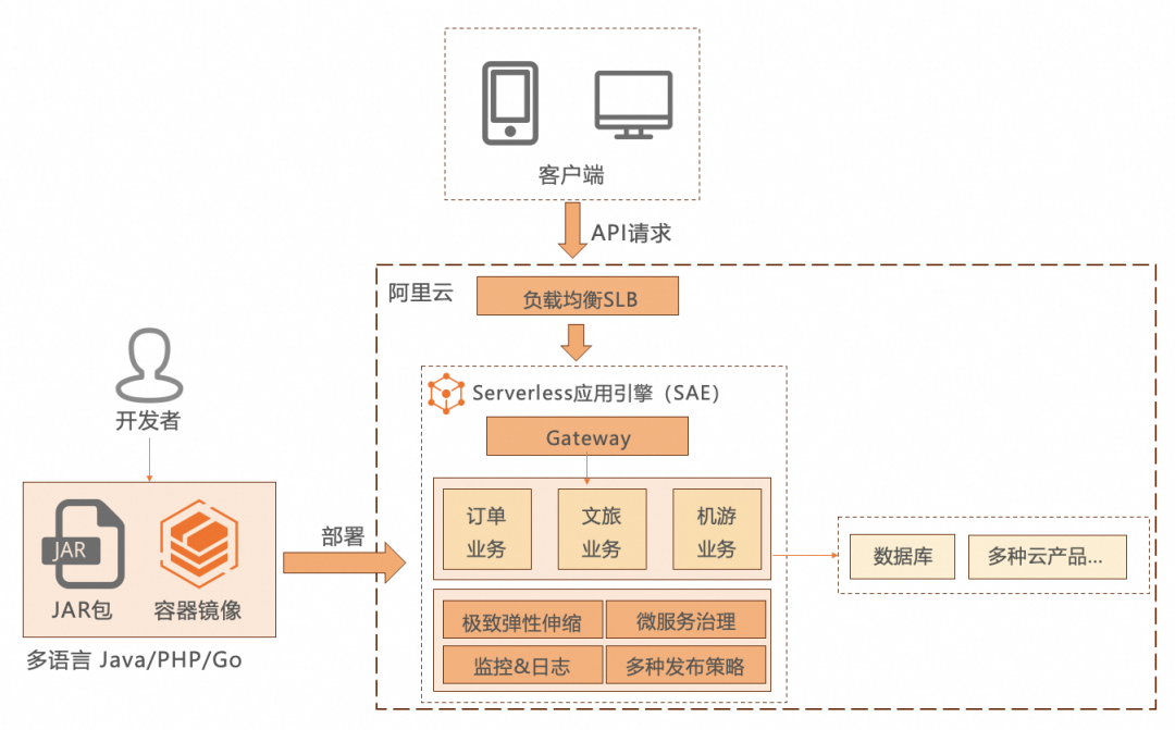 选择阿里云 Serverless 应用引擎(简称 SAE),不用做任何改造,WAR/JAR 包直接上传部署,也不用买机器运维机器,发版的时候也不需要逐台部署机器,为研发同学节省了大量时间。并且,SAE 就是一个超大规模的弹性资源池,想弹多少弹多少,想什么时候弹就什么时候弹,非常适合敦煌智旅节假日期间难以预估的流量激增。敦煌智旅决定把新平台部署在阿里云 Serverless 应用引擎上,SAE 提供了一个开箱即用的 Serverless PaaS 平台,提供了微服务、监控等能力,帮助敦煌智旅很好地解决了发版困难、运维困难、弹性能力不足和资源利用率低等痛点问题。
