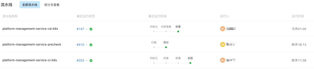 如图,以上是一个服务的流水线案例。一份代码一般通过三条流水线实现 CI、CD 流程。多环境镜像晋级/复用实现