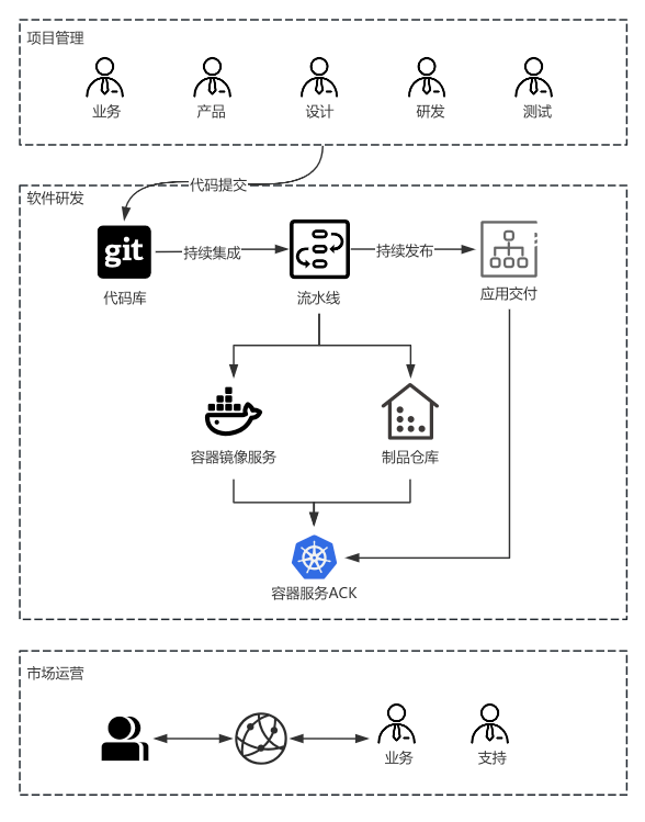 1. 完整度:云效给了众多情景解决方案,涉及项目管理、代码、流水线、应用交付、制品仓库,覆盖 DevOps 的整个生命周期。最关键的是流水线与 K8s 部署与 ECS 服务器部署直接傻瓜式打通,非常方便。2. 集成度:市场上不乏细化单一板块,提供了体系化解决方案的精品软件,如项目管理(Jira),对与成熟的大体量团队,可以考虑采用先进方法论整合。但是对于中小团队而言,整合难度过高。3. 成熟度:DevOps 的基础设施需要经过校验,能够稳定的支持开发日常工作。在提供必要性功能的同时,能支持企业的部分自主定义。4. 性价比:简单高效,单价最低,快速解决问题。减少汇报与团队成本。🔔 注:从 2021 年使用云效以来,我们经历过云效的多次升级改版,项目管理从 project 到 projex。服务部署也经历了流水线的 VM 部署、 K8s 部署和最后应用交付的 K8s 等多种改版优化。案例与方案以当前最新为主。