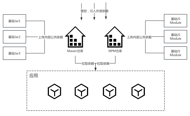 如果当前月份是 202406,我们在开发环境升级了基础组件版本,这个版本导致众多代码实现发生了变化。但是此时生产环境 202404 版本出现了问题。我们该如果处理?如果按照正常进度,202406 版本修改完成,发布上线已经是 202408 月份了,持续两个月的问题必然是灾难性的。如果临时基于历史版本修改,测试问题与代码项目间版本依赖又存在挑战。云效这边在 2023 年 12 月份提供了持续交付最佳实践[3]基本可以解决我们的问题,只不过我们的设计在这个的基础上略有增加,可以供大家思考。以下是引用云效多环境持续交付的实践,我们新增了约定和流水线流程:1. 每个最终上线发布的版本必须建立独立的分支,产生版本关联的有序版本号,在部署生命周期结束后必须丢弃。如 2024 年 6 月的分支为 release/202406,版本为 202406-20240630.539481。2. 每个 release 代码单独实现 codebase 理念,即除测试环境外,每个环境建立与之对应的测试环境,每个 release 分支形成独立的 codebase 生命周期。如预生产环境新增预生产测试环境。3. 与上两条对应的,建立上线测试期,如每月最后一周。要求非修复性代码禁止进入,最后一周提前切出代码到 release 分支,进入到 pre 阶段的测试环境中,并在验证后灰度发出到 preview 环境。在我们日常的开发,都会涉及到第三方模块依赖。如 Java 的 Maven 仓库,前端的 NPM 仓库。为了规范依赖引用、共享公共与基础代码组件、减少因外部依赖导致的网络问题,以及后期对第三方模块的安全性审查,我们采用【制品库】作为前后端微服务的 Maven 与 NPM 库,并结合【流水线】发布公共基础 Jar 与 JS Module。![]()
