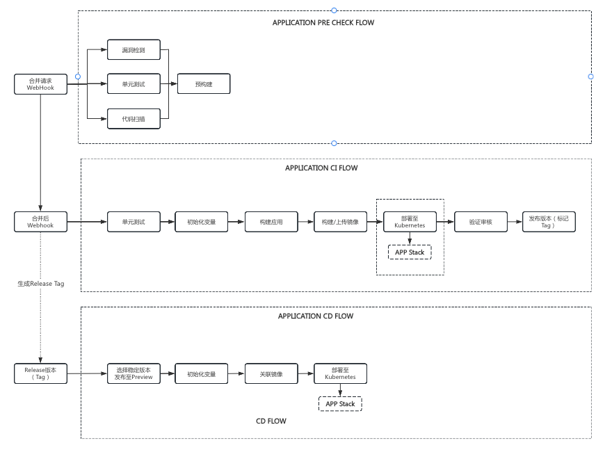- 持续集成流水线(命名规范:{application-name} – service/web- ci-k8s)代码合并到主分支后,接受 webhook 事件自动运行。主要以单元测试,构建镜像为主,并发布到测试环境中。经测试验证无误后,确认发布版本标签。
