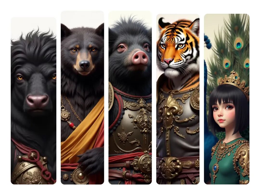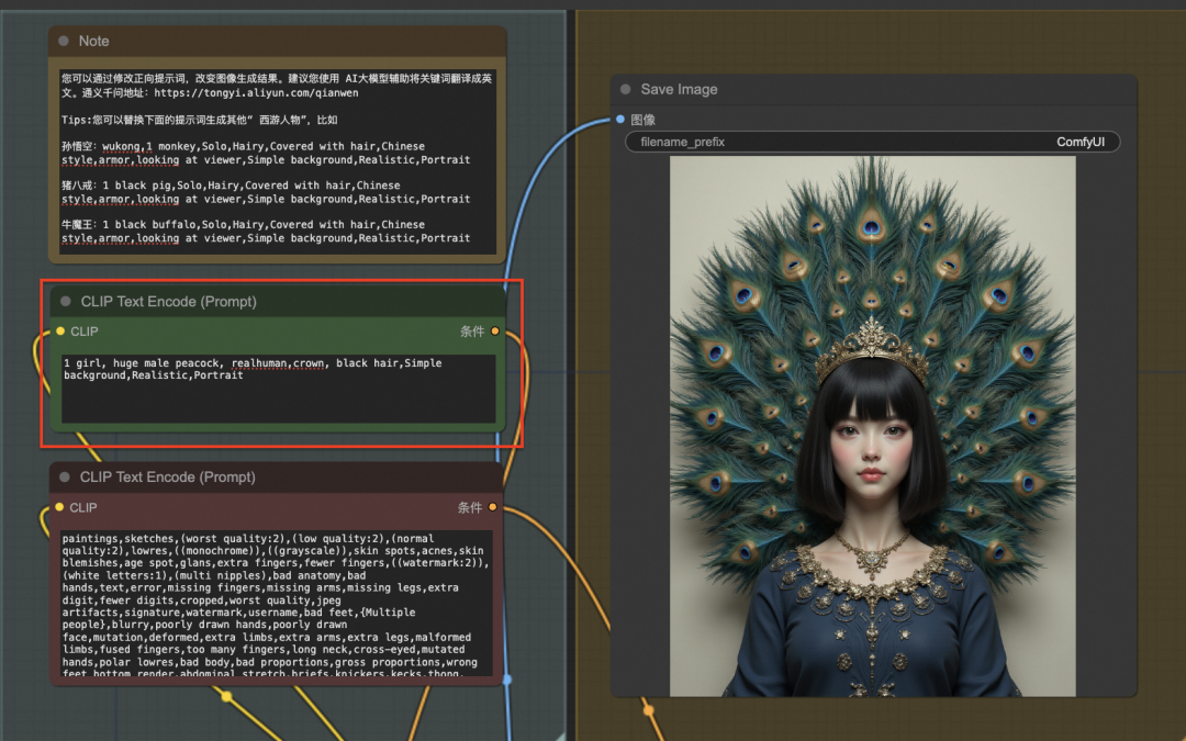 5. 您可以通过修改“正向提示词(绿色框)”生成更多西游人物,负面提示词(红色框)可不用修改,以下是几个正向提示词的例子,您可以根据需要使用。