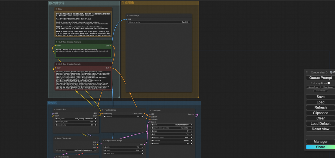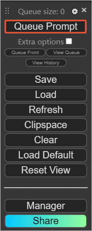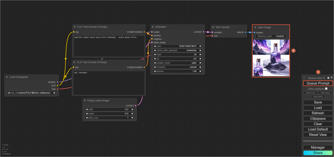 3. 在页面右下方,直接单击 Queue Prompt,通过默认的提示词生成图像。