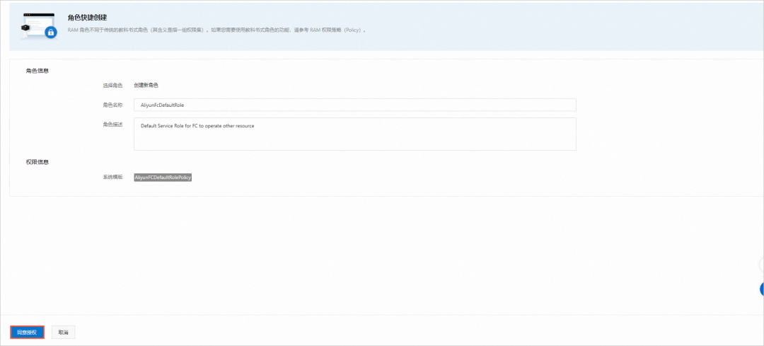 7. 在创建应用页面,角色名称请确认所需要的权限均已获取(若缺失权限请按照页面引导进行操作),同时保证文件存储 NAS 已经开通(如果没有开通,可根据提示进行开通,用来存储需要的 flux 模型 Lora 文件)。