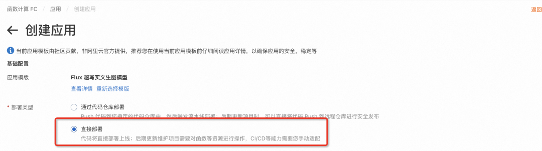 由于当前模板涉及 Github 以及 HuggingFace 等网站访问,国内部分地区可能无法直接使用。其他配置保持默认即可,然后单击创建应用。