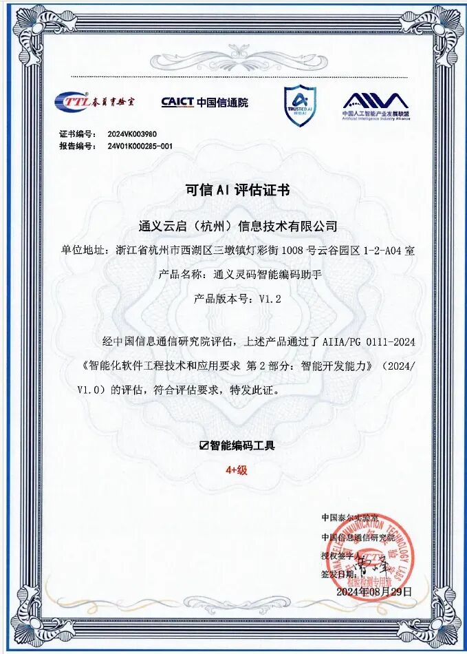 阿里云的通义灵码智能编码助手参与中国信通院组织的可信 AI 智能编码工具首轮评估,最终获得 4+ 级评级,成为国内首批通过该项评估并获得当前最高评级的企业之一。经评估,通义灵码智能编码助手的功能完善且具备较高准确性,可为用户提供较为优质流畅的使用体验,且在性能指标方面,其响应速度、并发处理能力、系统的稳定性,均具有优秀表现。同时在模型层和服务层,具备高效稳定的工程化能力,且知识库检索增强能力,以及对当前代码工程(Workspace)的理解能力较好。
