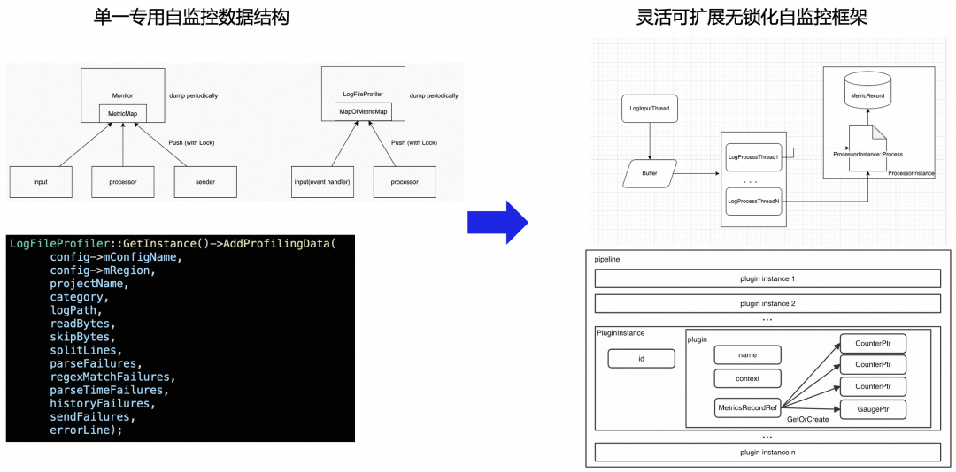 由于历史发展的局限性,原来 iLogtail 的配置文件仅仅考虑了有限的几种日志采集场景,而随着功能点演化,iLogtail 的配置就如图中最左侧所示越来越臃肿,由于缺乏结构和可扩展考虑,配置的嵌套越来越深、而平铺的字段也无法表达数据处理逻辑的先后顺序。这样的配置文件显然是难以使用的,因此在 iLogtail 开源时,我们使用了适配器模式,从表面上将 iLogtail 的配置文件改成了结构化的 YAML 格式。但当时一些根本性的问题还没有得到解决,导致例如 accelerate 插件是不能和其他插件组合使用的,处理插件的一些参数仍然平铺。而在 iLogtail 2.0 中这些遗留问题都得到了彻底的解决,如图中最右侧所示,原生的结构化配置摒弃了原有的种种限制,inputs、processors、flushers 井然有序,每个 processor 独立明确,可以非常清晰地表达整个数据采集的 pipeline。这种配置方式的扩展性极强,当需要添加新的采集插件时,不会干扰原有的配置架构,只需无缝集成即可投入使用。代码结构优化