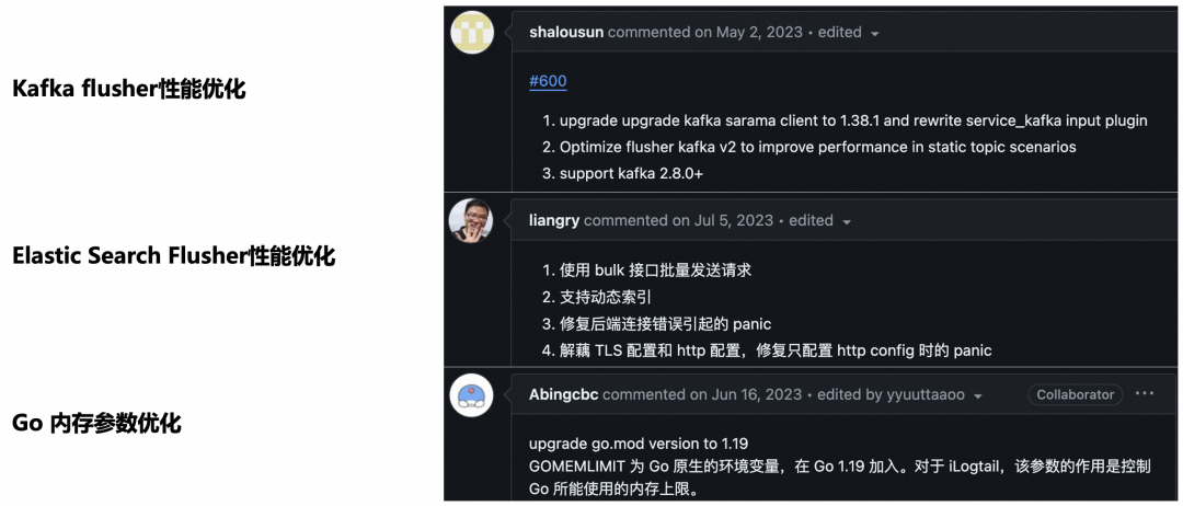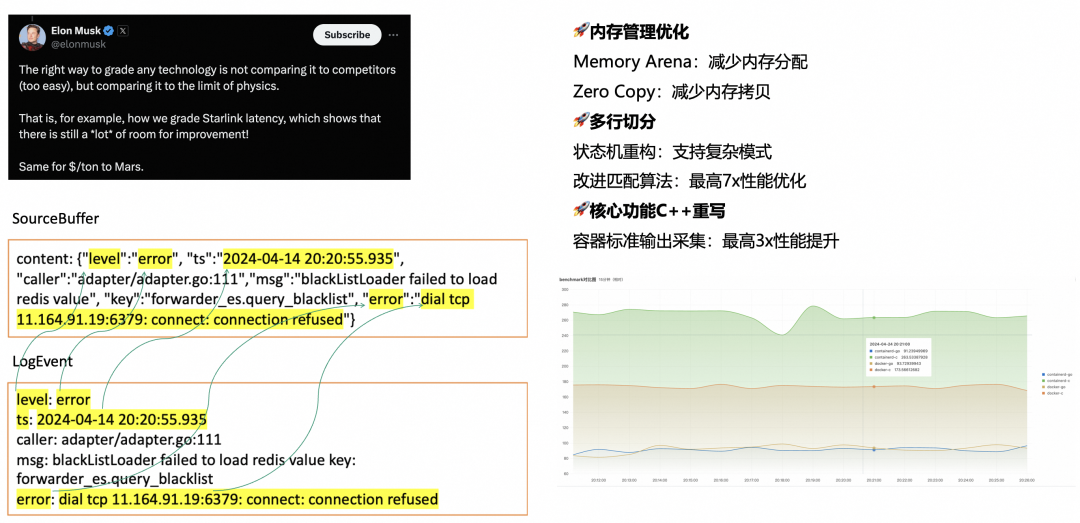 但正如埃隆·马斯克所说:“评价任何技术的正确方式不是和竞品比较,而是和物理学极限进行比较。”因此 iLogtail 并没有不思进取,安于现状,而是在 2.0 中实现了对自我性能的超越。在 2.0 版本中,我们对内存管理进行了进一步优化,使用 Memory Arena 技术减少内存的分配次数,并在新模型的数据结构中大量使用 Zero Copy 技术减少内存拷贝。如图中左下所示,读取数据后 iLogtail 会尽可能复用读取分配的内存,尽可能减少内存的再分配。因此 iLogtail 2.0 不仅在可扩展性上超越了 1.x 版本,而且在采集的性能上也毫不妥协。在日志多行切分的能力上,iLogtail 2.0 对状态机进行了重构,支持复杂模式,不限于行首正则、行尾正则、行中正则和它们的组合,并且支持多种格式的嵌套,如 containerd 换行+内容多行。不仅切分能力更强,改进的匹配算法在部分数据集上提供了相比原来最高 7 倍的性能提升。在 iLogtail 2.0 中还对核心功能进行了 C++ 重写,如数据过滤、脱敏等,而容器标准输出采集则是它们的典型代表,全新的容器标准输出采集插件,不仅在大数据量、快速轮转时稳定性更强,并且实测有最高 3 倍的性能提升,资源占用更是只有原来的 N 分之一。从右下图,可以明显地看到新老采集插件的性能差距(上面 2 条线分别为新插件采集 containerd 和 docker 标准输出到表现)。同时,社区的参与和贡献对于 iLogtail 的持续增强起着至关重要的作用。社区成员孙宇持续为 Kafka 相关的插件贡献优化,社区成员梁若羽为 Elastic Search Flusher 引入批量发送性能优化,社区成员陈柄畅帮助 iLogtail 升级到 Go 1.19 并加入了内存参数优化的机制。正是这样的社区活跃度和各成员的专业贡献,使得iLogtail在性能提升和稳定性增强方面不断取得显著的进步。![]()