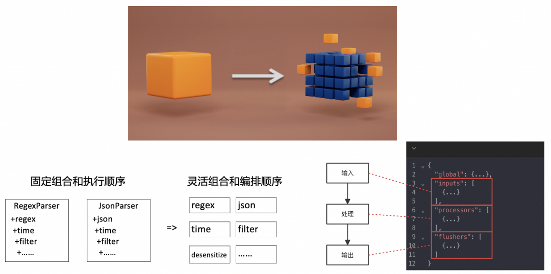 不难发现,现代的采集代理均具备内存上限控制、反压、磁盘缓冲队列等有助于提高系统整体稳定性和保证数据不丢失的技术。而 iLogtail 由于诞生于阿里内部的复杂多租环境,需要保证租户间的故障隔离,因此还具备多租隔离的能力。3)灵活性