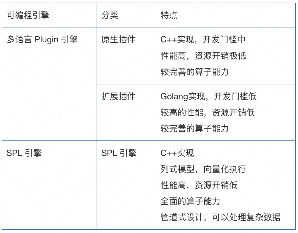 从上面的介绍中可以看到,iLogtail 的可扩展性并不是第一天就设计好的。原来的 iLogtail 更侧重于性能的极致性,很多内存复用、免拷贝的特性都是基于单体架构、固定流程优化的。但这种架构难以适应数据处理高频的需求变化,耦合的流程意味着所有数据都必须经过固定的处理步骤,使得每增加一个处理步骤都会使已有的 Parse 流程更加臃肿。为了彻底解决这个问题,iLogtail 需要对处理流水线进行模块化重构,以支持处理插件的灵活组合和自由编排,并能通过新增插件达到处理能力可扩展的目的。在引入 Go 插件框架后,其实 iLogtail 已经解决了部分可扩展的问题,但因为跨语言通信带来的损耗和 Go 本身的内存固定开销,所以带来可扩展性的同时也牺牲了部分采集代理的性能和资源开销。在 iLogtail 2.0 中,我们对 C++ 部分的流水线也进行了模块化改造,改造后的流水线可以对 input、processor、flusher 进行插件扩展,并且支持插件的灵活编排和组合。C++ 流水线的改造,使得 iLogtail 原来的性能和资源占用优势得到了进一步的巩固,在可扩展和高性能之间再也不用妥协。此外,在引入模块化的 C++ 流水线的同时,我们对 C++ 和 Go 之间的数据传递链路进行了扩展,优化了他们的互操作性。在 2.0 版本中,C++ 处理流水线终于可以与 Go 处理流水线进行串联执行,而在后续版本中我们即将支持 Go 输入插件与 C++ 处理流水线串联执行,使得任意输入都可以享受到 C++ 处理的高性能。在可扩展的基础上,iLogtail 顺应时代发展的大趋势,进一步发展了 SPL 可编程数据处理的功能。SPL 进一步降低了数据处理的门槛,提供了统一的数据处理逻辑表达。从上图的示例中可以看到,我们日志采集到的数据大部分情况下是非结构化的,而真正方便做日志查询分析的日志应该是结构化的,因此最大化日志的价值要求我们能够高效地探索非结构化的日志数据,并能将其结构化,而这正是 SPL 能够提供的核心价值。通过图中的案例,我们可以了解 SPL 是如何工作的。在这段 SPL 中,我们完成了日志的正则提取、时间提取、JSON 解析和字段筛选,如果要完成同样的工作,使用插件的话就需要编写 4 个插件的配置。因此,在复杂数据处理场景下,SPL 在表达的流畅性和精简性上更胜一筹。对于 iLogtail 的使用者来说,可以根据自身的需求自由地选择数据处理的方式,下表总结了两种可编程引擎的差异。![]()